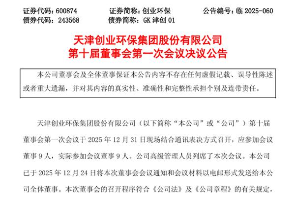 天津创业环保集团股份有限公司(简称:创业环保)于2025年12月31日召开第十届董事会第一次会议,审议通过了如下议案: 1.关于选举唐福生先生为公司第十届董事会董事长的议案 董事会同意选举唐福生先生为公司第十届董事会董事长,主持董事会工作。任期与其作为公司第十届董事会董事的任期一致(自2025年12月31日起至2028年12月30...