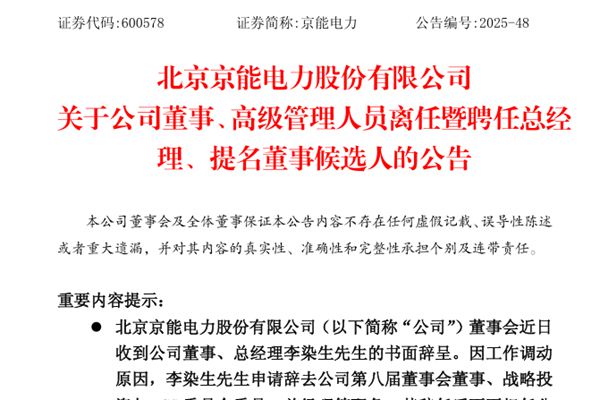 北京京能电力股份有限公司(简称:京能电力)公告称,公司董事会近日收到公司董事、总经理李染生先生的书面辞呈。因工作调动原因,李染生先生申请辞去公司第八届董事会董事、战略投资与ESG委员会委员、总经理等职务,其辞任后不再担任公司任何职务。图源:京能电力公告 12月26日,京能电力召开第八届董事会第十三次会议,同意聘任杨松先生为公司总经理...