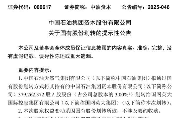 据中国石油集团资本股份有限公司(简称:中油资本)近日发布的《关于国有股份划转的提示性公告》,中国石油天然气集团有限公司(下称“中国石油集团”)拟通过国有股份划转方式将其持有的中油资本379,262,372 股 A 股股份(占公司总股本的3.00%)划转给国网英大国际控股集团有限公司(下称“国网英大集...