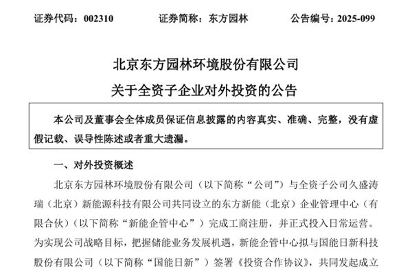 北京东方园林环境股份有限公司(简称:东方园林)近日公告称,公司与全资子公司久盛涛瑞(北京)新能源科技有限公司共同设立的东方新能(北京)企业管理中心(有限合伙)(下称“新能企管中心”)完成工商注册,并正式投入日常运营。 据悉,为实现公司战略目标,把握储能业务发展机遇,新能企管中心拟与国能日新科技股份有限公司(下...