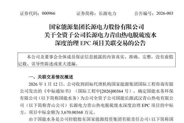 国家能源集团长源电力股份有限公司(简称:长源电力)公告称,公司于1月12日收到招标代理机构国家能源集团国际工程咨询有限公司发出的《中标通知书》,确定国能水务环保有限公司(下称“国能水务”)为公司全资子公司国能长源武汉青山热电有限公司(下称“青山公司”)长源电力青山热电脱硫废水深度治理EP...