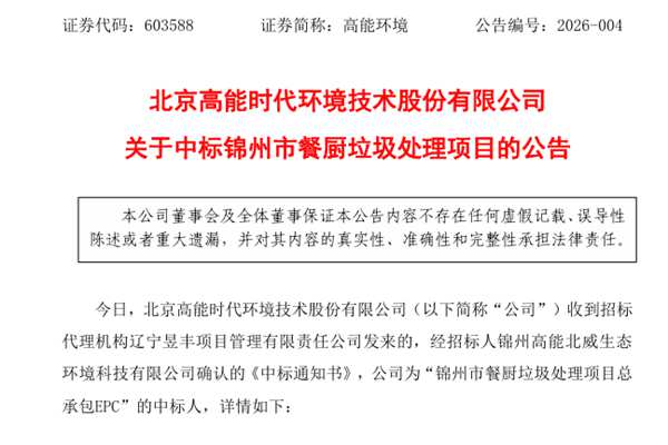 北京高能时代环境技术股份有限公司(简称:高能环境)近日公告称,公司已收到招标代理机构辽宁昱丰项目管理有限责任公司发来的,经招标人锦州高能北威生态环境科技有限公司确认的《中标通知书》,公司为“锦州市餐厨垃圾处理项目总承包EPC”的中标人。 1、项目名称:辽宁省锦州市餐厨垃圾处理项目总承包EPC 2、中标人名称...