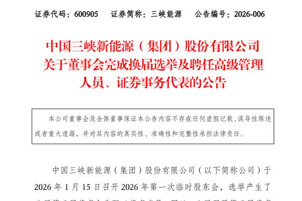 中国三峡新能源(集团)股份有限公司(简称:三峡能源)于2026年1月15日召开2026年第一次临时股东会,选举产生了公司第三届董事会非职工董事成员。同日,公司召开第三届董事会第一次会议,审议通过了选举董事长、董事会专门委员会成员,聘任高级管理人员及证券事务代表等相关议案。 一、第三届董事会及专门委员会组成情况 根据公司2026年第...