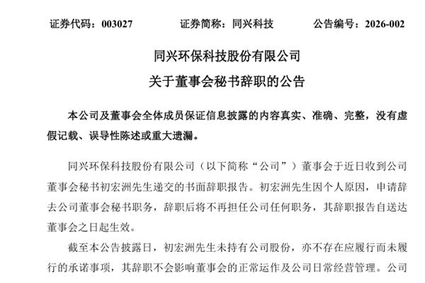 同兴环保科技股份有限公司(简称:同兴科技)公告称,公司董事会于近日收到董事会秘书初宏洲先生递交的书面辞职报告。初宏洲先生因个人原因,申请辞去公司董事会秘书职务,辞职后将不再担任公司任何职务,其辞职报告自送达董事会之日起生效。 截至本公告披露日,初宏洲先生未持有公司股份,亦不存在应履行而未履行的承诺事项,其辞职不会影响董事会的正常运作...