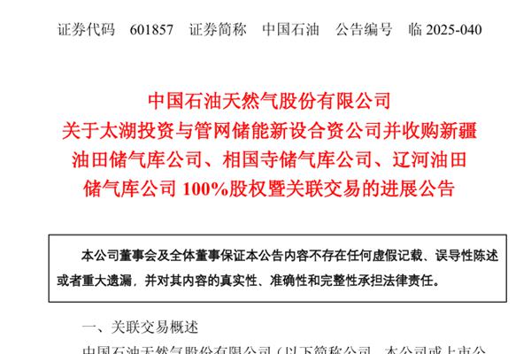 中国石油天然气股份有限公司(简称:中国石油)近日公告称,下属全资子公司中石油太湖(北京)投资有限公司(下称“太湖投资”)合计现金出资1,604,206.00万元与相关合资方共同设立的三家合资公司,分别收购中国石油天然气集团有限公司(下称“集团公司”)下属三家全资子公司100%股权,即三家...
